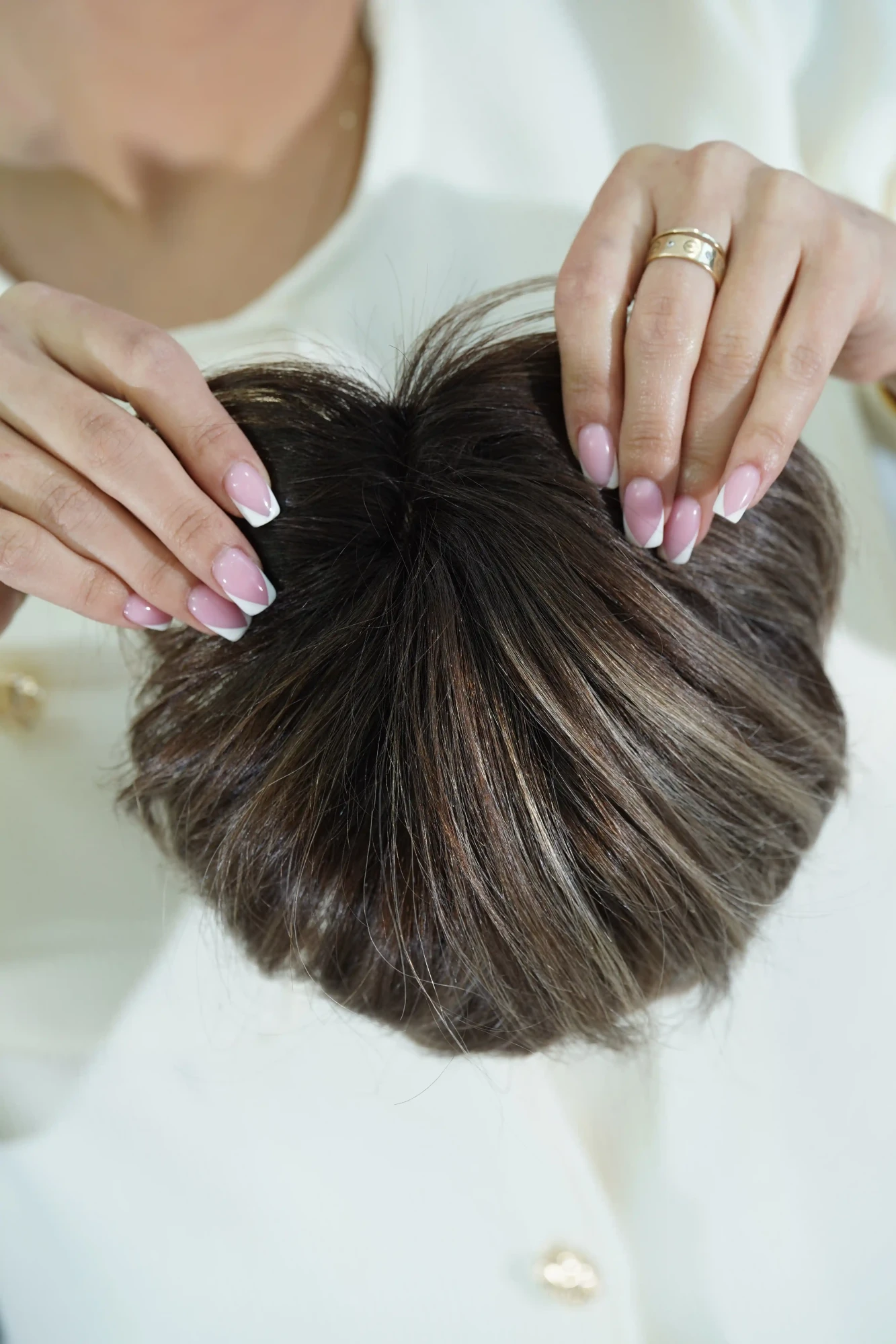 18 ზომა თარგი, გვერდზე გადაყოფილი მელირებით, 20 სმ თმის სიგრძე