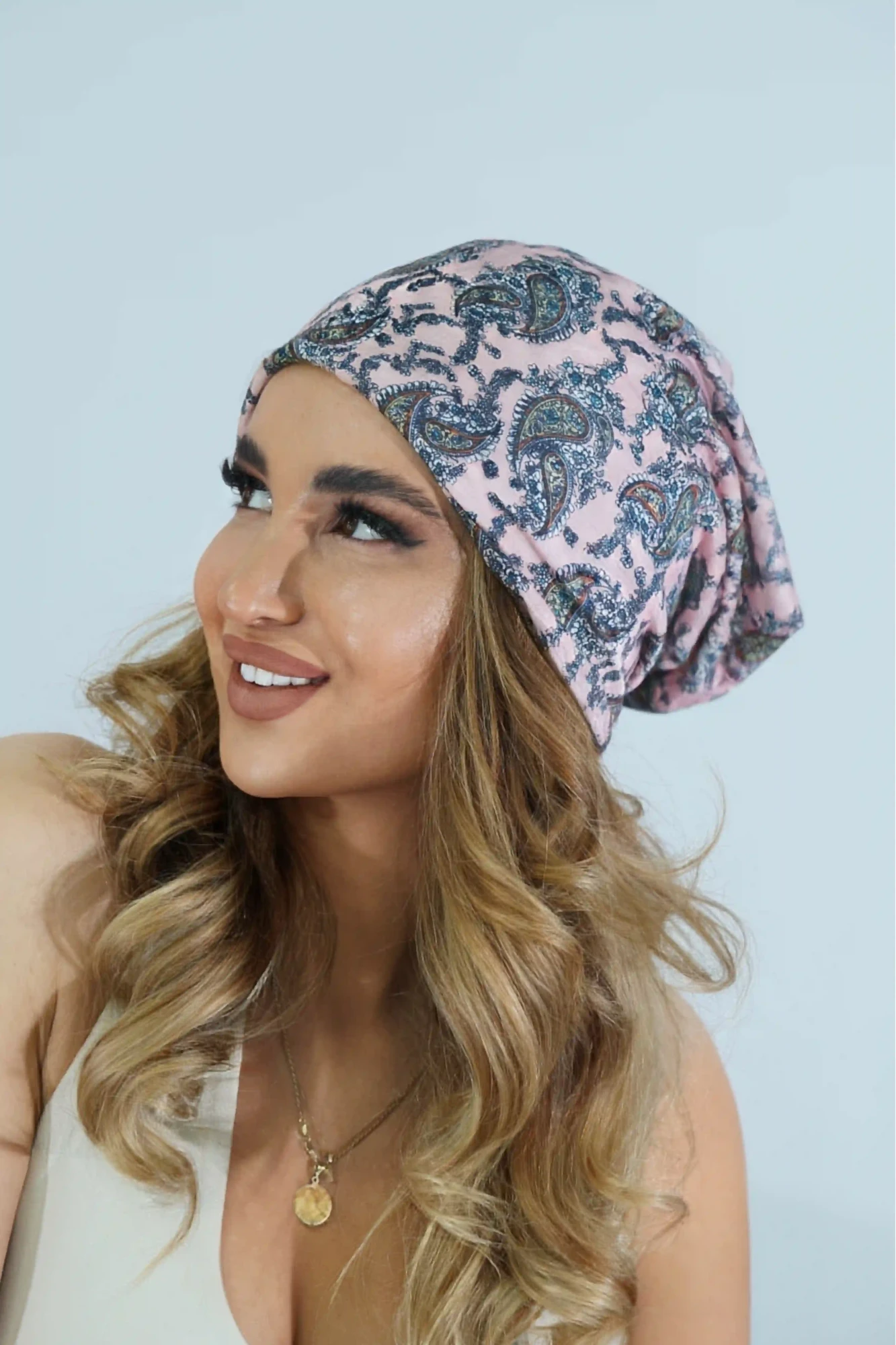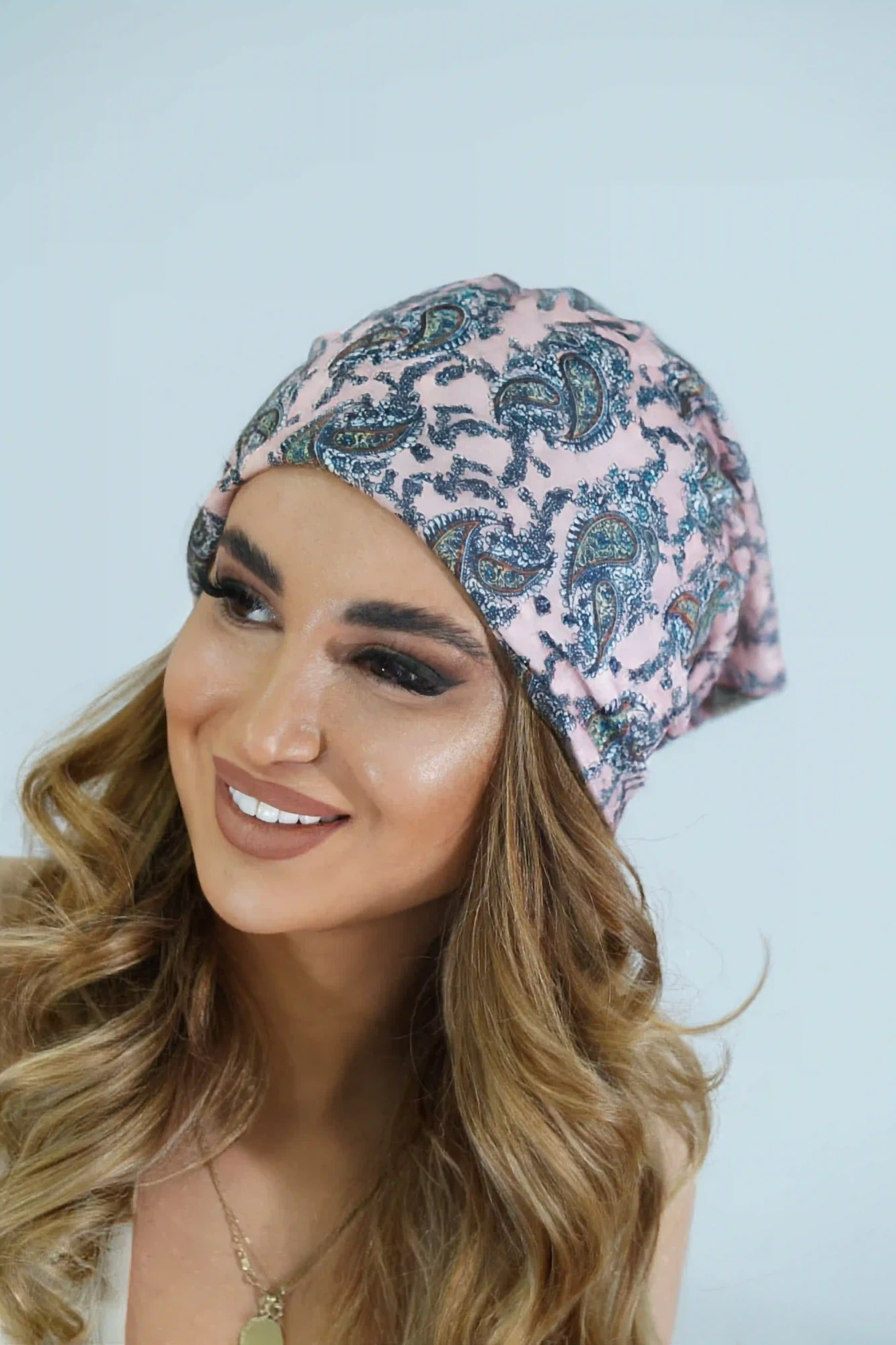 ღია ვარდისფერი ჩალმა ცისფერი პრინტით